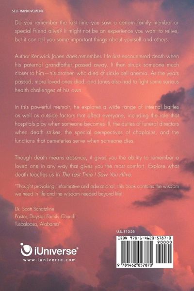 Do you remember the last time you saw a certain family member or special friend alive? It might not be an experience you want to relive, but it can tell you some important things about yourself and others. Author Renwick Jones does remember. He first encountered death when his paternal grandfather passed away. It then struck someone much closer to him-his brother, who died of sickle cell anemia. As the years passed, more loved ones died, and Jones also had to fight some serious health challenges of his own. In this powerful memoir, he explores a wide range of internal battles as well as outside factors that affect everyone, including the role that hospitals play when someone becomes ill, the duties of funeral directors when death strikes, the special perspectives of chaplains, and the functions that cemeteries serve when someone dies. Though death means absence, it gives you the ability to remember a loved one in any way that gives you the most comfort. Explore what death teaches us in The Last Time I Saw You Alive.