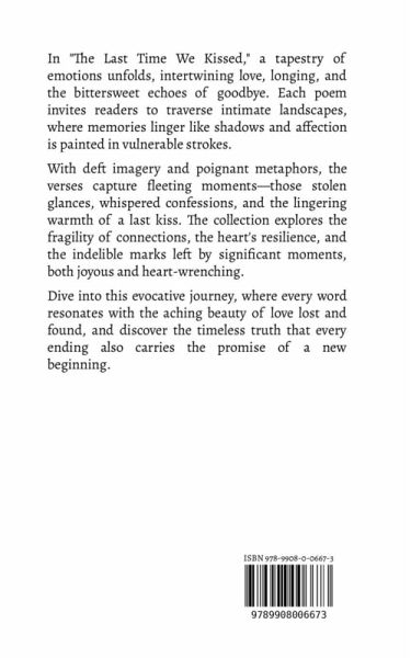 In "The Last Time We Kissed," a tapestry of emotions unfolds, intertwining love, longing, and the bittersweet echoes of goodbye. Each poem invites readers to traverse intimate landscapes, where memories linger like shadows and affection is painted in vulnerable strokes. With deft imagery and poignant metaphors, the verses capture fleeting moments-those stolen glances, whispered confessions, and the lingering warmth of a last kiss. The collection explores the fragility of connections, the heart's resilience, and the indelible marks left by significant moments, both joyous and heart-wrenching. Dive into this evocative journey, where every word resonates with the aching beauty of love lost and found, and discover the timeless truth that every ending also carries the promise of a new beginning.