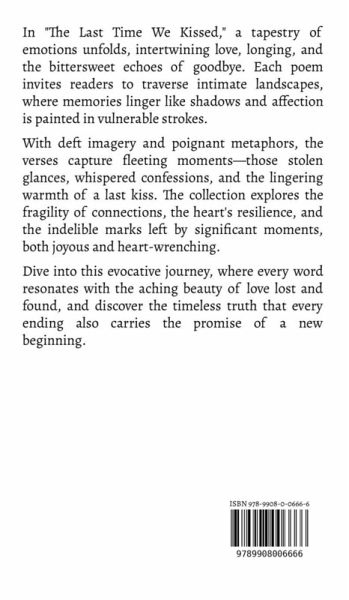 In "The Last Time We Kissed," a tapestry of emotions unfolds, intertwining love, longing, and the bittersweet echoes of goodbye. Each poem invites readers to traverse intimate landscapes, where memories linger like shadows and affection is painted in vulnerable strokes. With deft imagery and poignant metaphors, the verses capture fleeting moments-those stolen glances, whispered confessions, and the lingering warmth of a last kiss. The collection explores the fragility of connections, the heart's resilience, and the indelible marks left by significant moments, both joyous and heart-wrenching. Dive into this evocative journey, where every word resonates with the aching beauty of love lost and found, and discover the timeless truth that every ending also carries the promise of a new beginning.
