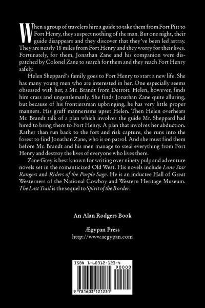 They are nearly 18 miles from Fort Henry and they worry for their lives. Fortunately, for them, Jonathan Zane and his companion were dispatched by Colonel Zane to search for them and they reach Fort Henry safely. Helen Sheppard's family goes to Fort Henry to start a new life. She has many young men who are interested in her. One especially seems obsessed with her, a Mr. Brandt from Detroit. Helen, however, finds him crass and ungentlemanly. She finds Jonathan Zane quite alluring, but because of his frontiersman upbringing, he has very little proper manners. His gruff mannerisms upset Helen. Then Helen overhears Mr. Brandt talk of a plan which involves the guide Mr. Sheppard had hired to bring them to Fort Henry. A plan that involves her abduction. Rather than run back to the fort and risk capture, she runs into the forest to find Jonathan Zane, who is on patrol. And she must find them before Mr. Brandt and his men manage to steal everything from Fort Henry and destroy the lives of everyone who lives there. The Last Trail is the sequel to Spirit of the Border. Zane Grey is best known for writing over ninety pulp and adventure novels set in the romanticized Old West. His novels include Lone Star Rangers and Riders of the Purple Sage. He is an inductee Hall of Great Westerners of the National Cowboy and Western Heritage Museum. The Last Trail is the sequel to Spirit of the Border.