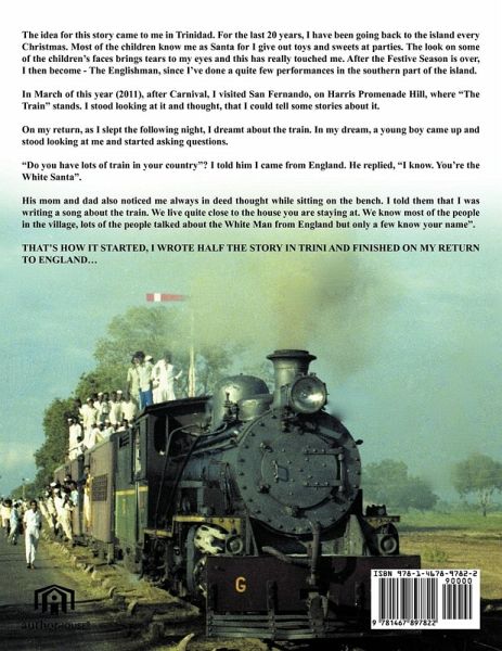 The idea for this story came to me in Trinidad. For the last 20 years, I have been going back to the island every Christmas. Most of the children know me as Santa for I give out toys and sweets at parties. The look on some of the children's faces brings tears to my eyes and this has really touched me. After the Festive Season is over, I then become - The Englishman, since I've done a quite few performances in the southern part of the island. In March of this year (2011), after Carnival, I visited San Fernando, on Harris Promenade Hill, where "The Train" stands. I stood looking at it and thought, that I could tell some stories about it. On my return, as I slept the following night, I dreamt about the train. In my dream, a young boy came up and stood looking at me and started asking questions. "Do you have lots of train in your country"? I told him I came from England. He replied, "I know. You're the White Santa". His mom and dad also noticed me always in deed thought while sitting on the bench. I told them that I was writing a song about the train. We live quite close to the house you are staying at. We know most of the people in the village, lots of the people talked about the White Man from England but only a few know your name". THAT'S HOW IT STARTED, I WROTE HALF THE STORY IN TRINI AND FINISHED ON MY RETURN TO ENGLAND...