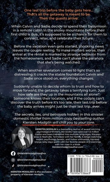 "When Calvin and Sadie decide to spend their babymoon in a remote cabin in the snowy mountains before their first child is due, it's supposed to be a chance for them to connect, relax, and celebrate their future. Before the vacation even gets started, shocking news leaves the couple reeling. To make matters worse, their arrival at the rental is marked by strange behavior from the homeowners, and Sadie can't shake the paranoia that she's being watched. When another revelation comes to light that's so distressing it cracks the stable foundation Calvin and Sadie once stood on, everything changes. Suddenly unable to decide whom to trust and how to move forward, the getaway takes a terrifying turn. Just how safe are they up in the mountains all alone? Someone knows their location, and if the couple can't discover the truth before it's too late, their last trip before the baby arrives might just be their last trip...ever"--