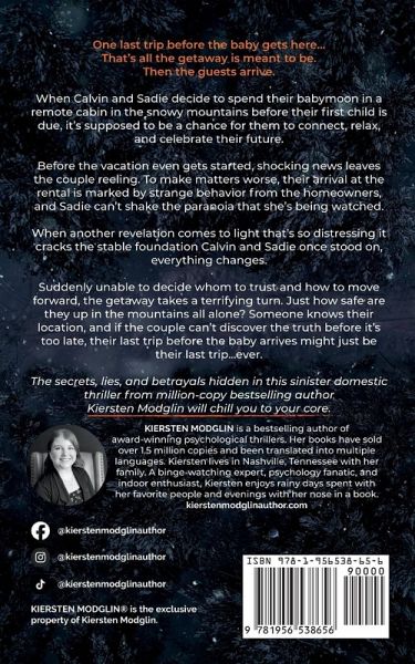 "When Calvin and Sadie decide to spend their babymoon in a remote cabin in the snowy mountains before their first child is due, it's supposed to be a chance for them to connect, relax, and celebrate their future. Before the vacation even gets started, shocking news leaves the couple reeling. To make matters worse, their arrival at the rental is marked by strange behavior from the homeowners, and Sadie can't shake the paranoia that she's being watched. When another revelation comes to light that's so distressing it cracks the stable foundation Calvin and Sadie once stood on, everything changes. Suddenly unable to decide whom to trust and how to move forward, the getaway takes a terrifying turn. Just how safe are they up in the mountains all alone? Someone knows their location, and if the couple can't discover the truth before it's too late, their last trip before the baby arrives might just be their last trip...ever"--