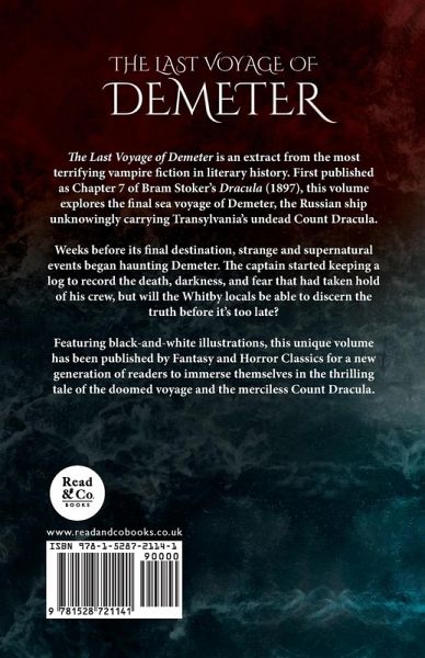 A ghost ship is wrecked in Whitby's harbour and the only clue to the whereabouts of the missing crew is in these clippings from the captain's log. Delve into the last voyage of Demeter in this harrowing chapter from Bram Stoker's Dracula. The Last Voyage of Demeter is an extract from the most terrifying vampire fiction in literary history. First published as Chapter 7 of Bram Stoker's Dracula (1897), this volume explores the final sea voyage of Demeter, the Russian ship unknowingly carrying Transylvania's undead Count Dracula. Weeks before its final destination, strange and supernatural events began haunting Demeter. The captain started keeping a log to record the death, darkness, and fear that had taken hold of his crew, but will the Whitby locals be able to discern the truth before it's too late? Featuring black-and-white illustrations, this unique volume has been published by Fantasy and Horror Classics for a new generation of readers to immerse themselves in the thrilling tale of the doomed voyage and the merciless Count Dracula.