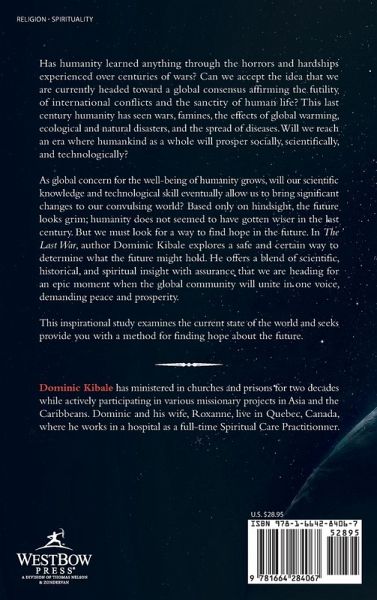 Has humanity learned anything through the horrors and hardships experienced over centuries of wars? Can we accept the idea that we are currently headed toward a global consensus affirming the futility of international conflicts and the sanctity of human life? This last century humanity has seen wars, famines, the effects of global warming, ecological and natural disasters, and the spread of diseases. Will we reach an era where humankind as a whole will prosper socially, scientifically, and technologically? As global concern for the well-being of humanity grows, will our scientific knowledge and technological skill eventually allow us to bring significant changes to our convulsing world? Based only on hindsight, the future looks grim; humanity does not seemed to have gotten wiser in the last century. But we must look for a way to find hope in the future. In The Last War, author Dominic Kibale explores a safe and certain way to determine what the future might hold. He offers a blend of scientific, historical, and spiritual insight with assurance that we are heading for an epic moment when the global community will unite in one voice, demanding peace and prosperity. This inspirational study examines the current state of the world and seeks provide you with a method for finding hope about the future.