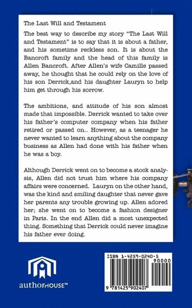 The best way to describe my story "The Last Will and Testament" is to say that it is about a father, and his sometime reckless son. It is about the Bancroft family and the head of this family is Allen Bancroft. After Allen''s wife Camille passed away, he thought that he could rely on the love of his son Derrick,and his daughter Lauryn to help him get through his sorrow. The ambitions, and attitude of his son almost made that impossible. Derrick wanted to take over his father''s computer company when his father retired or passed on.. However, as a teenager he never wanted to learn anything about the company business as Allen had done with his father when he was a boy. Although Derrick went on to become a stock analysis, Allen did not trust him where his company affairs were concerned. Lauryn on the other hand, was the kind and smiling daughter that never gave her parents any trouble growing up. Allen adored her; she went on to become a fashion designer in Paris. In the end Allen did a most unexpected thing. Something that Derrick could never imagine his father ever doing.