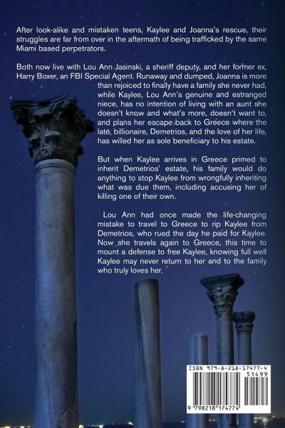 After look-alike and mistaken teens, Kaylee and Joanna's rescue, their struggles are far from over in the aftermath of being trafficked by the same Miami based perpetrators. Both now live with Lou Ann Jasinski, a sheriff deputy, and her former ex, Harry Boxer, an FBI Special Agent. Runaway and dumped, Joanna is more than rejoiced to finally have a family she never had, while Kaylee, Lou Ann's genuine and estranged niece, has no intention of living with an aunt she doesn't know and what's more, doesn't want to, and plans her escape back to Greece where the late, billionaire, Demetrios, and the love of her life, has willed her as sole beneficiary to his estate. But when Kaylee arrives in Greece primed to inherit Demetrios' estate, his family would do anything to stop Kaylee from wrongfully inheriting what was due them, including accusing her of killing one their own. Lou Ann had once made the life-changing mistake to travel to Greece to rip Kaylee from Demetrios, who rued the day he paid for Kaylee. Now she travels again to Greece, this time to mount a defense to free Kaylee, knowing full well Kaylee may never return to her and to the family who truly loves her.