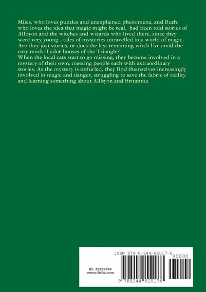 Miles, who loves puzzles and unexplained phenomena, and Ruth, who loves the idea that magic might be real, had been told stories of Allbyon and the witches and wizards who lived there, since they were very young - tales of mysteries unravelled in a world of magic. Are they just stories, or does the last remaining witch live amid the cosy mock-Tudor houses of the Triangle? When the local cats start to go missing, they become involved in a mystery of their own, meeting people each with extraordinary stories. As the mystery is unfurled, they find themselves increasingly involved in magic and danger, struggling to save the fabric of reality and learning something about Allbyon and Britannia.