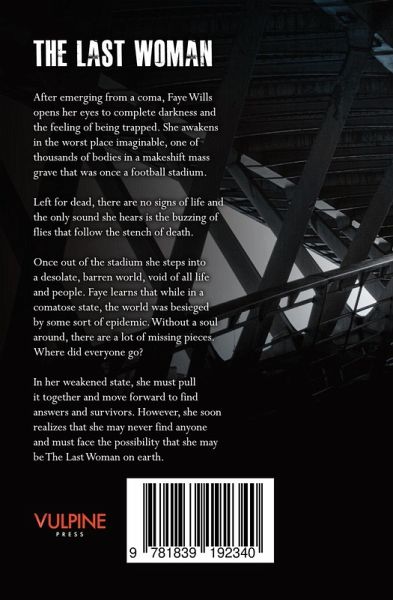 After emerging from a coma, Faye Wills opens her eyes to complete darkness and the feeling of being trapped. She awakens in the worst place imaginable, one of thousands of bodies in a makeshift mass grave that was once a football stadium.Left for dead, there are no signs of life and the only sound she hears is the buzzing of flies that follow the stench of death.Once out of the stadium she steps into a desolate, barren world, void of all life and people. Faye learns that while in a comatose state, the world was besieged by some sort of epidemic. Without a soul around, there are a lot of missing pieces. Where did everyone go?In her weakened state, she must pull it together and move forward to find answers and survivors. However, she soon realizes that she may never find anyone and must face the possibility that she may be The Last Woman on earth.