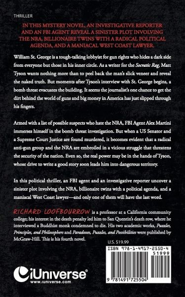 William St. George is a tough-talking lobbyist for gun rights who hides a dark side from everyone but those in his inner circle. As a writer for the Socratic Rag, Matt Tyson wants nothing more than to peel back the man's slick veneer and reveal the naked truth. But moments after Tyson's interview with St. George begins, a bomb threat evacuates the building. It seems the journalist's one chance to get the dirt behind the world of guns and big money in America has just slipped through his fingers. Armed with a list of possible suspects who hate the NRA, FBI Agent Alex Martini immerses himself in the bomb threat investigation. But when a US Senator and a Supreme Court Justice are found murdered, it becomes evident that a radical anti-gun group and the NRA are embroiled in a vicious struggle that threatens the security of the nation. Even so, the real power may be in the hands of Tyson, whose drive to write a good story soon leads him into dangerous territory. In this political thriller, an FBI agent and an investigative reporter uncover a sinister plot involving the NRA, billionaire twins with a political agenda, and a maniacal West Coast lawyer-and only one of them will have the last word.