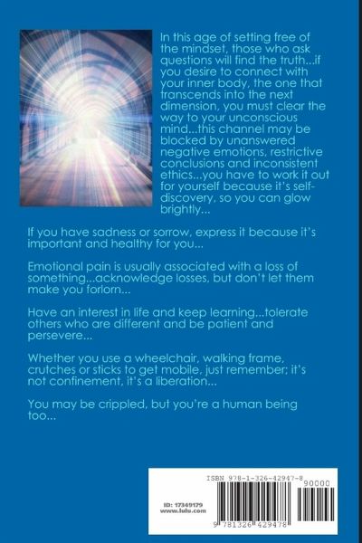 This story covers the controversial topic of what happens when you die, what you experience and the phenomenal power of the mind to work consciously, unconsciously and sub consciously. It also covers the way that death leads me to live a life with brain damage. I literally had to learn to live again. Extracts of the text have been used to teach university students who study topics associated with closed brain damage. This is a step by step account of how my crippled mind was taught to work,my struggle to understand how it works and the implications of its consciousness.