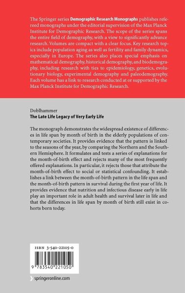 This stimulating, carefully-researched book on The Late Life Legacy of Very Early Life by Dr. Gabriele Doblhammer is the second volume of a new series of Demographic Research Monographs published by Springer Verlag. The topic of the book is fascinating. Is a person's lifespan influ enced by health and nutrition in-utero and shortly after birth? If so, why? The answers uncovered by the diligence, demographic and statistical ex pertise, and probing intelligence of the author are surprising but convinc ing. To pry open the mystery of the lingering impact of very early life, Dr. Doblharnmer focuses on month of birth. It turns out that people born in some months live substantially longer on average than people born in other months, not because of astrological forces but for reasons of health and nutrition. Dr. Doblhammer was educated in statistics and demography and earlier this year was the first person ever to receive the "Habilitation" de gree, the recognition given in the German-speaking world to proven scho lars who are qualified to become professors, in Demography. This book, which is evidence that she fully deserves this award, will not only provide important new fmdings about the legacy of early life but will also serve as a comprehensive foundation of knowledge on which future scholars can build. The series of Demographic Research Monographs is under the editorial supervision of the Max Planck Institute for Demographic Research. Prof. James W. Vaupel, Founding Director of the Institute, is Editor-in-Chief.