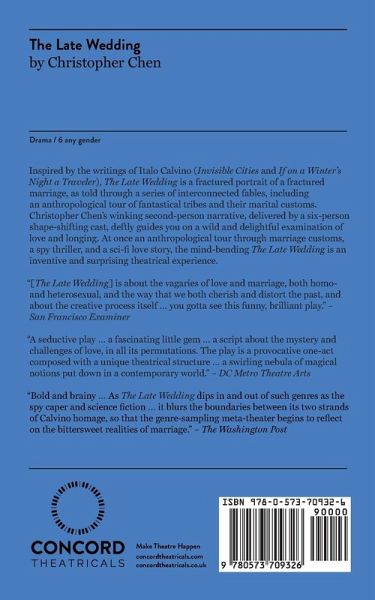 Inspired by the writings of Italo Calvino (Invisible Cities and If on a Winter's Night a Traveler), The Late Wedding is a fractured portrait of a fractured marriage, as told through a series of interconnected fables, including an anthropological tour of fantastical tribes and their marital customs. Christopher Chen's winking second-person narrative, delivered by a six-person shape-shifting cast, deftly guides you on a wild and delightful examination of love and longing. At once an anthropological tour through marriage customs, a spy thriller, and a sci-fi love story, the mind-bending The Late Wedding is an inventive and surprising theatrical experience.