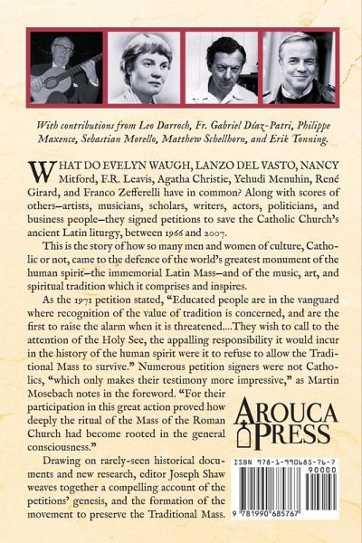 With contributions from Leo Darroch, Fr. Gabriel Díaz-Patri, Philippe Maxence, Sebastian Morello, Matthew Schellhorn, and Erik TonningWhat do Evelyn Waugh, Lanzo Del Vasto, Nancy Mitford, F.R. Leavis, Agatha Christi, Yehudi Menuhin, René Girard, and Franco Zefferelli have in common? Along with scores of others-artists, musicians, scholars, writers, actors, politicians, and business people-they signed petitions to save the Catholic Church's ancient Latin liturgy, between 1966 and 2007. This is the story of how so many men and women of culture, Catholic or not, came to the defence of the world's greatest monument of the human spirit-the immemorial Latin Mass-and of the music, art, and spiritual tradition which it comprises and inspires. As the 1971 petition stated, "Educated people are in the vanguard where recognition of the value of tradition is concerned, and are the first to raise the alarm when it is threatened.... They wish to call to the attention of the Holy See, the appalling responsibility it would incur in the history of the human spirit were it to refuse to allow the Traditional Mass to survive." Numerous petitions signers were not Catholics, "which only makes their testimony more impressive," as Martin Mosebach notes in the foreword. "For their participation in this great action proved how deeply the ritual of the Mass of the Roman Church had become rooted in the general consciousness." Drawing on rarely-seen historical documents and new research, editor Joseph Shaw weaves together a compelling account of the petitions' genesis, and the formation of the movement to preserve the Traditional Mass.