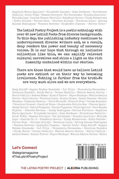 The LatinX Poetry Project is a poetic anthology with over 45 new LatinX Poets from diverse backgrounds sharing their unique & heartfelt poetry on themes as immigration, social justice & feminism today. This book is for anyone who wants to take a poetic journey into the richness of LatinX culture & storytelling today. The LatinX Poetry Project es una antología poética con más de 45 poetas LatinX de diversos países y culturas.Su poesía busca compartir sus pensamientos sobre temas como la inmigración, justicia social y el feminismo en el presente. Este libro es para todos aquellos que quieren tomar un viaje poético por la riqueza de nuestra cultura e historias que resuenan con nuestro mundo, un lugar de reflexión -donde la diversidad nos hace más humanos.