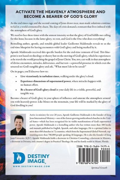 ACTIVATE THE HEAVENLY ATMOSPHERE AND BECOME A BEARER OF GOD'S GLORY As the end times rage and the second coming of Jesus draws near, man-made solutions continue to fail in a world consumed by chaos. The days of crisis demand a remnant that lives imbued with the atmosphere of God's glory. We need to face these times with the utmost intensity so that the glory of God fulfills our calling for this hour, because in the latter glory, we rest, and God is the One who does everything!Bestselling author, apostle, and notable global leader Guillermo Maldonado reveals to us the end-time blueprint for having encounters with God's glory and being marked by it. Apostle Maldonado received this specific burden for the end-time remnant of God. This blueprint is not based on theology or theory but on the moving of God's glory, which he experiences as he travels the world preaching the gospel of Jesus Christ. You, too, can walk in that atmosphere of divine encounters, miracles, deliverance, and harvest-a powerful presence in which even the unsaved see God's tangible glory and ask, "What must I do to be saved?" On its pages, you'll discover how to: Live victoriously in turbulent times, walking under the glory's cloud. Experience dimensions of supernatural power, where miracles happen with no human effort. Be a bearer of God's glory cloud in your daily life in a visible, powerful, and tangible way. Become a bearer of God's glory in your sphere of influence and saturate the atmosphere around you with heavenly power. Like Moses on the mountain, your life will be marked by the glory of God dwelling in you!