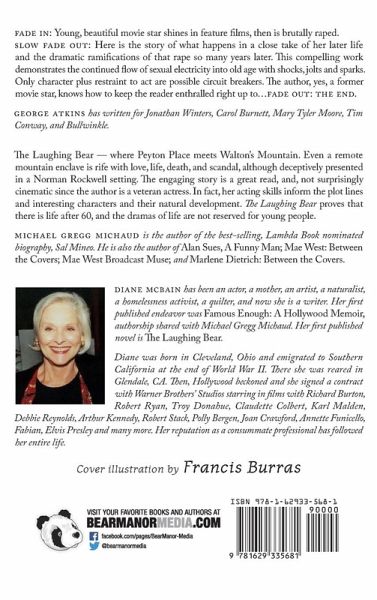 Fade in: Young, beautiful movie star shines in feature films, then is brutally raped. Slow Fade Out: Here is the story of what happens in a close take of her later life and the dramatic ramifications of that rape so many years later. This compelling work demonstrates the continued flow of sexual electricity into old age with shocks, jolts and sparks. Only character plus restraint to act are possible circuit breakers. The author, yes, a former movie star, knows how to keep the reader enthralled right up to…fade out: the end. George Atkins has written for Jonathan Winters, Carol Burnett, Mary Tyler Moore, Tim Conway, and Bullwinkle. The Laughing Bear — where Peyton Place meets Walton’s Mountain. Even a remote mountain enclave is rife with love, life, death, and scandal, although deceptively presented in a Norman Rockwell setting. The engaging story is a great read, and, not surprisingly cinematic since the author is a veteran actress. In fact, her acting skills inform the plot lines and interesting characters and their natural development. The Laughing Bear proves that there is life after 60, and the dramas of life are not reserved for young people. Michael Gregg Michaud is the author of the best-selling, Lambda Book nominated biography, Sal Mineo. He is also the author of Alan Sues, A Funny Man; Mae West: Between the Covers; Mae West Broadcast Muse; and Marlene Dietrich: Between the Covers. Diane McBain has been an actor, a mother, an artist, a naturalist, a homelessness activist, a quilter, and now she is a writer. Her first published endeavor was Famous Enough: A Hollywood Memoir, authorship shared with Michael Gregg Michaud. Her first published novel is The Laughing Bear. Diane was born in Cleveland, Ohio and emigrated to Southern California at the end of World War II. There she was reared in Glendale, CA. Then, Hollywood beckoned and she signed a contract with Warner Brothers’ Studios starring in films with Richard Burton, Robert Ryan, Troy Donahue, Claudette Colbert, Karl Malden, Debbie Reynolds, Arthur Kennedy, Robert Stack, Polly Bergen, Joan Crawford, Annette Funicello, Fabian, Elvis Presley and many more. Her reputation as a consummate professional has followed her entire life.