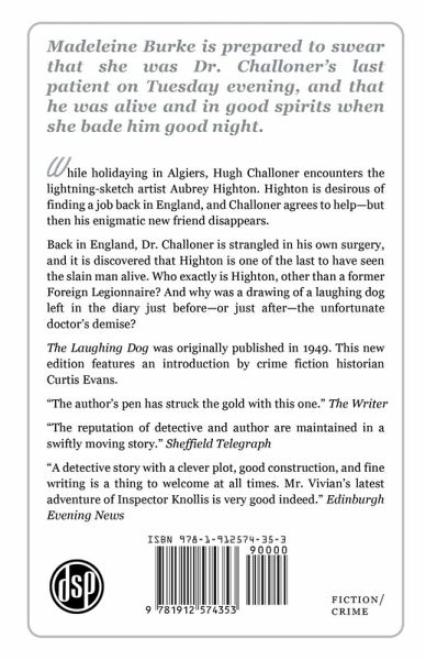 Madeleine Burke is prepared to swear that she was Dr. Challoner’s last patient on Tuesday evening, and that he was alive and in good spirits when she bade him good night. While holidaying in Algiers, Hugh Challoner encounters the lightning-sketch artist Aubrey Highton. Highton is desirous of finding a job back in England, and Challoner agrees to help—but then his enigmatic new friend disappears. Back in England, Dr. Challoner is strangled in his own surgery, and it is discovered that Highton is one of the last to have seen the slain man alive. Who exactly is Highton, other than a former Foreign Legionnaire? And why was a drawing of a laughing dog left in the diary just before—or just after—the unfortunate doctor’s demise? The Laughing Dog was originally published in 1949. This new edition features an introduction by crime fiction historian Curtis Evans. "The author’s pen has struck the gold with this one." The Writer "The reputation of detective and author are maintained in a swiftly moving story." Sheffield Telegraph "A detective story with a clever plot, good construction, and fine writing is a thing to welcome at all times. Mr. Vivian’s latest adventure of Inspector Knollis is very good indeed." Edinburgh Evening News