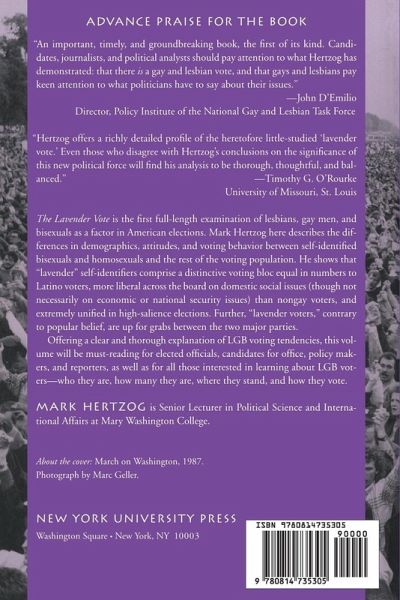 Traces the influences of lesbian, gay and bisexual voters in American elections In the half century since the Stonewall riots in New York City's Greenwich Village launched the national gay-rights movement in earnest, LGB voters have steadily expanded their political influence. The Lavender Vote is the first full- length examination of lesbians, gay men, and bisexuals as a factor in American elections. Mark Hertzog here describes the differences in demographics, attitudes, and voting behavior between self-identified bisexuals and homosexuals and the rest of the voting population. He shows that lavender self-identifiers comprise a distinctive voting bloc equal in numbers to Latino voters, more liberal across the board on domestic social issues (though not necessarily on economic or national security issues) than non-gay voters, and extremely unified in high-salience elections. Further, lavender voters, contrary to popular belief, are up for grabs between the two major parties. Offering a clear and thorough explanation of LGB voting tendencies, this volume will be must-reading for elected officials, candidates for office, and all those interested in learning about LGB voters.