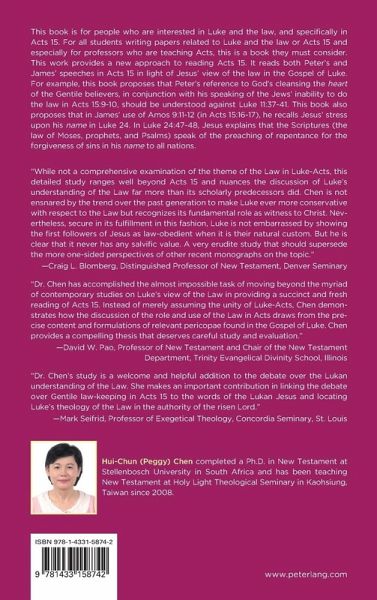 "Dr. Chen's study is a welcome and helpful addition to the debate over the Lukan understanding of the Law. She makes an important contribution in linking the debate over Gentile law-keeping in Acts 15 to the words of the Lukan Jesus and locating Luke's theology of the Law in the authority of the risen Lord." -Mark Seifrid, Professor of Exegetical Theology, Concordia Seminary, St. Louis