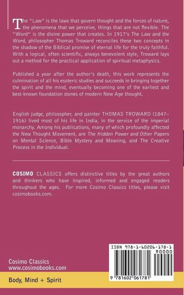 The "Law" is the laws that govern thought and the forces of nature, the phenomena that we perceive, things that are not flexible. The "Word" is the divine power that creates. In 1917's The Law and the Word, philosopher Thomas Troward reconciles these two concepts in the shadow of the Biblical promise of eternal life for the truly faithful. With a logical, often scientific, always benevolent style, Troward lays out a method for the practical application of spiritual metaphysics. Published a year after the author's death, this work represents the culmination of all his esoteric studies and succeeds in bringing together the spirit and the mind, eventually becoming one of the earliest and best-known foundation stones of modern New Age thought. English judge, philosopher, and painter THOMAS TROWARD (1847-1916) lived most of his life in India, in the service of the imperial monarchy. Among his publications, many of which profoundly affected the New Thought Movement, are The Hidden Power and Other Papers on Mental Science, Bible Mystery and Meaning, and The Creative Process in the Individual.