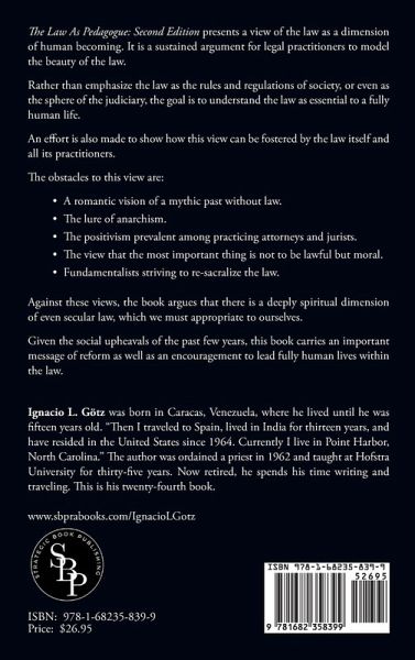 The Law As Pedagogue: Second Edition presents a view of the law as a dimension of human becoming. It is a sustained argument for legal practitioners to model the beauty of the law. Rather than emphasize the law as the rules and regulations of society, or even as the sphere of the judiciary, the goal is to understand the law as essential to a fully human life. An effort is also made to show how this view can be fostered by the law itself and all its practitioners. The obstacles to this view are: A romantic vision of a mythic past without law. The lure of anarchism. The positivism prevalent among practicing attorneys and jurists. The view that the most important thing is not to be lawful but moral. Fundamentalists striving to re-sacralize the law. Against these views, the book argues that there is a deeply spiritual dimension of even secular law, which we must appropriate to ourselves. Given the social upheavals of the past few years, this book carries an important message of reform as well as an encouragement to lead fully human lives within the law. (About the Author) Ignacio L. Götz was born in Caracas, Venezuela, where he lived until he was fifteen years old. "Then I traveled to Spain, lived in India for thirteen years, and have resided in the United States since 1964. Currently I live in Point Harbor, North Carolina." The author was ordained a priest in 1962 and taught at Hofstra University for thirty-five years. Now retired, he spends his time writing and traveling. This is his twenty-fourth book.
