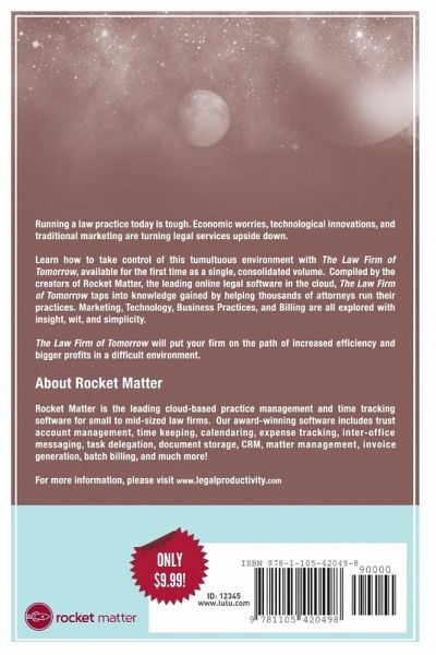 Running a law practice today is tough. Economic worries, technological innovations, and traditional marketing are turning legal services upside down. Learn how to take control of this tumultuous environment with The Law Firm of Tomorrow, available for the first time as a single, consolidated volume. Compiled by the creators of Rocket Matter, the leading online legal software in the cloud, The Law Firm of Tomorrow taps into knowledge gained by helping thousands of attorneys run their practices. Marketing, Technology, Business Practices, and Billing are all explored with insight, wit, and simplicity. The Law Firm of Tomorrow will put your firm on the path of increased efficiency and bigger profits in a difficult environment.