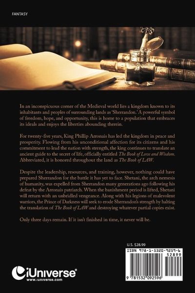 In an inconspicuous corner of the Medieval world lies a kingdom known to its inhabitants and peoples of surrounding lands as 'Sherrandon.' A powerful symbol of freedom, hope, and opportunity, this is home to a population that embraces its ideals and enjoys the liberties abounding therein. For twenty-five years, King Phillip Arronais has led the kingdom in peace and prosperity. Flowing from his unconditional affection for its citizens and his commitment to lead the nation with strength, the king continues to translate an ancient guide to the secret of life, officially entitled The Book of Love and Wisdom. Abbreviated, it is honored throughout the land as The Book of LAW. Despite the leadership, resources, and training, however, nothing could have prepared Sherrandon for the battle it has yet to face. Shetani, the arch nemesis of humanity, was expelled from Sherrandon many generations ago following his defeat by the Arronais patriarch. When the banishment period is lifted, Shetani will return with an unbridled vengeance. Along with his legions of malevolent warriors, the Prince of Darkness will seek to erode Sherrandon's strength by halting the translation of The Book of LAW and destroying whatever partial copies exist. Only three days remain. If it isn't finished in time, it never will be.