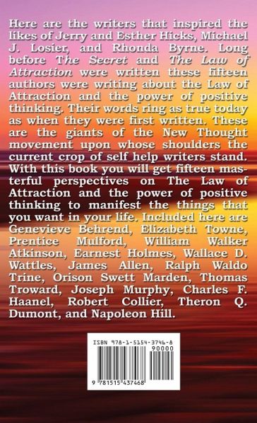 Here are the writers that inspired the likes of Jerry and Esther Hicks, Michael J. Losier, and Rhonda Byrne. Long before The Secret and The Law of Attraction were written these fifteen authors were writing about the Law of Attraction and the power of positive thinking. Their words ring as true today as when they were first written. These are the giants of the New Thought movement upon whose shoulders the current crop of self help writers stand. With this book you will get fifteen masterful perspectives on The Law of Attraction and the power of positive thinking to manifest the things that you want in your life. Included here are Genevieve Behrend, Elizabeth Towne, Prentice Mulford, William Walker Atkinson, Earnest Holmes, Wallace D. Wattles, James Allen, Ralph Waldo Trine, Orison Swett Marden, Thomas Troward, Joseph Murphy, Charles F. Haanel, Robert Collier, Theron Q. Dumont, and Napoleon Hill.