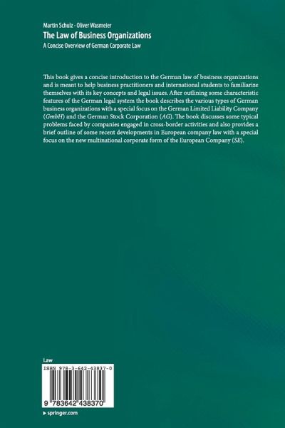 This book gives a concise introduction to the German law of business organizations and is meant to help business practitioners and international students to familiarize themselves with its key concepts and legal issues. After outlining some characteristic features of the German legal system the book describes the various types of German business organizations with a special focus on the German Limited Liability Company (GmbH) and the German Stock Corporation (AG). The book discusses some typical problems faced by companies engaged in cross-border activities and also provides a brief outline of some recent developments in European company law with a special focus on the new multinational corporate form of the European Company (SE).