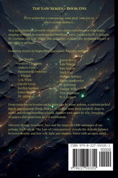 The Law of Consequences: A Fantastical Anthology Every action has a consequence, some good, some less so, others of pure darkness... Step into a fantastical world where every choice reverberates with magic, shaping destinies in wondrous and terrifying ways. Curated by W.A. Leggatt, SC Gowland and G.M. White, this anthology explores the profound impact of the choices we make. Featuring 20 stories by bestselling and award-winning authors: - Alex Weight - Andrew Chapman - Andrew Guile - Emmanuella Dekonor - G B Ralph - G.M. White - Gareth Lewis - Jocelyn Sordoni - Julian Barr - JW Atkinson - Karen Storey - Kate Baker - Kate Kenzie - Mark Stay - Morgan Delaney - Richie Janukowicz - SC Gowland - Tommy Wills - Trey Montague - W.A. Leggatt From surprises in hessian sacks, pubs run by stone golems, a curious packed lunch, questionable drink choices, to copper urns (best avoided), dogs in space, horrifying boarding schools, families torn apart by war, brooding strangers and suspicious jars of marmalade. Discover drama, treachery, love and the unpredictable, and often astonishing outcomes of our actions. Each tale in 'The Law of Consequences' reveals the delicate balance between destiny and free will, light and shadow. Enter with an open mind...