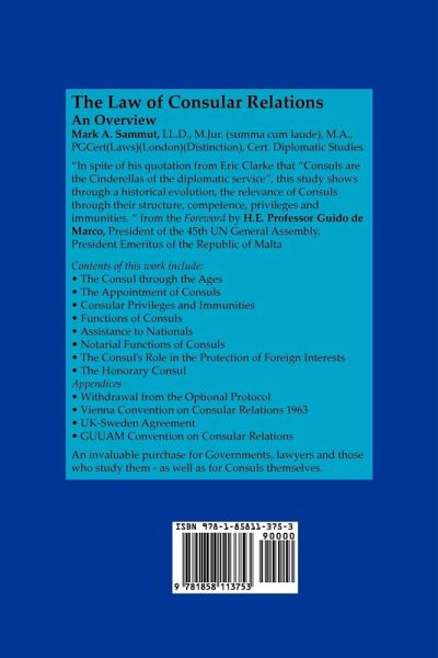 "In spite of his quotation from Eric Clarke that "Consuls are the Cinderellas of the diplomatic service", this study shows through a historical evolution, the relevance of Consuls through their structure, competence, privileges and immunities. " from the Foreword by H.E. Professor Guido de Marco, President of the 45th UN General Assembly, President Emeritus of the Republic of Malta Contents of this work include: . The Consul through the Ages . The Appointment of Consuls . Consular Privileges and Immunities . Functions of Consuls . Assistance to Nationals . Notarial Functions of Consuls . The Consul's Role in the Protection of Foreign Interests . The Honorary Consul Appendices . Withdrawal from the Optional Protocol . Vienna Convention on Consular Relations 1963 . UK-Sweden Agreement . GUUAM Convention on Consular Relations An invaluable purchase for Governments, lawyers and those who study them - as well as for Consuls themselves.