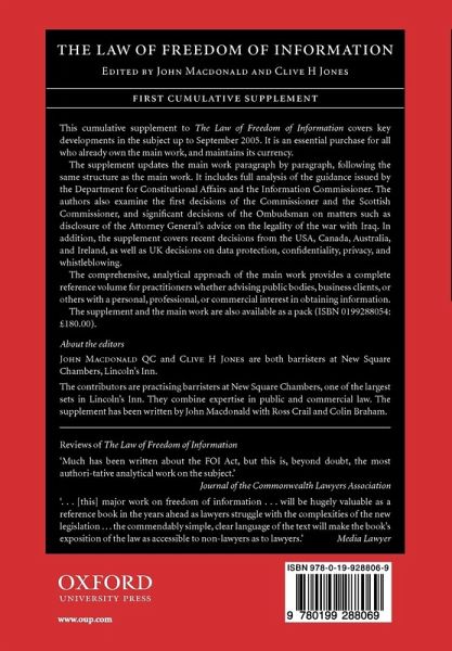 This supplement to The Law of Freedom of Information covers all of the key developments in the subject up to June 2005, and is an essential purchase for all who have already bought the main work. It includes full analysis of the guidance issued by the Department for Constitutional Affairs in October 2004 and the current awareness guidance and policy development documents issued by the Information Commissioner. The authors also examine the first decisions of the Commissioner and the decisions of the Ombudsman including her ruling on the disclosure of the advice given by the Attorney General on the legality of the war with Iraq. In addition, the supplement covers recent decisions from the USA, Canada, New Zealand, Australia and Ireland, as well as UK decisions on data protection and confidentiality. The supplement and the main work are also available as a pack (ISBN 0199288054: $350.00).