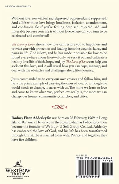 Without love, you will feel sad, depressed, oppressed, and suppressed. And a life without love brings loneliness, isolation, abandonment, and confusion. So if youre feeling despised, rejected, sad, and miserable because your life is without love, where can you turn to be celebrated and comforted? The Law of Love shows how love can restore you to happiness and provide you with protection and healing from the wounds, hurts, and pains in life. God is love, and he has made it possible for love to be found everywhere in our livesif only we seek it out and cultivate a healthy love life of faith, hope, and joy. The Law of Love can help you seek out this love, and it will reveal how you can cope, manage, and deal with the obstacles and challenges along lifes journey. Jesus commanded us to carry our own crosses and follow him, and he is the prime example of carrying the cross of love. So although the world needs to change, it starts with us. The more we learn to love and come to know what true, perfect love really is, the more we can change our homes, communities, churches, and cities.