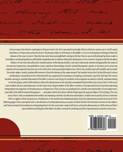 I do not expect this book to stand upon its literary merits; for if it is unsound in principle, felicity of diction cannot save it, and if sound, homeliness of expression cannot destroy it. My primary object in offering it to the public is to assist in bringing Psychology within the domain of the exact sciences. That this has never been accomplished is owing to the fact that no successful attempt has been made to formulate a working hypothesis sufficiently comprehensive to embrace all psychic phenomena. It has, however, long been felt by the ablest thinkers of our time that all psychic manifestations of the human intellect, normal or abnormal, whether designated by the name of mesmerism, hypnotism, somnambulism, trance, spiritism, demonology, miracle, mental therapeutics, genius, or insanity, are in some way related; and consequently, that they are to be referred to some general principle or law, which, once understood, will simplify and correlate the whole subject-matter, and possibly remove it from the domain of the supernatural. The London Society for Psychical Research, whose ramifications extend all over the civilized world, was organized for the purpose of making a systematic search for that law. The Society numbers among its membership many of the ablest scientists now living. Its methods of investigation are purely scientific, and painstaking to the last degree, and its field embraces all psychic phenomena. It has already accumulated and verified a vast array of facts of the most transcendent interest and importance. In the mean time a large number of the ablest scientists of Europe and America have been pursuing independent investigations in the phenomena of hypnotism. They too have accumulated facts and discovered principles of vast importance, especially in the field of mental therapeutics, - principles which also throw a flood of light upon the general subject of Psychology. This vast array of facts, thus accumulated and verified, and awaiting scientific classification and analysis, would seem to justify at least a tentative effort to apply to them the processes of induction, to the end that the fundamental law of psychic phenomena may be discovered. In the following pages I have attempted such a classification of verified phenomena, accounts of which I find in the literature current on the subject; and I have tentatively formulated a working hypothesis for the systematic study of all classes of psychic phenomena. It will be observed that I have availed myself largely of the labors of others, instead of confining myself to experimental researches of my own. I have done this for two reasons: first that I might avoid the accusation of having conducted a series of experiments for the purpose of sustaining a pet theory of my own; and second, because I hold that substantial progress cannot be made in science until one is ready to accord due credit to human integrity, and to give due weight to human testimony. In conclusion, I desire to say that I claim no credit for this work, save that which is due to an honest desire to promote the truth for its own sake. Sincerely believing in the correctness of my hypothesis, I have not hesitated to follow it to its legitimate conclusion in every field which I have entered. If at the close of the book I have seemed to trespass upon the forbidden field of theological discussion, it was not for the purpose of sustaining any preconceived opinions of my own; far from it. It was because I was irresistibly led to my conclusions by the terms of my hypothesis and the inflexible logic of its application. I cannot but be aware that my conclusions sometimes oppose the preconceived opinions of others. But no one who accepts my hypothesis as the true one will be compelled more frequently than I have been to renounce his former convictions. T. J. H. WASHINGTON, D. C. October 21, 1892