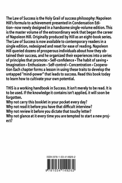 The Law of Success is the Holy Grail of success philosophy: Napoleon Hill's formula to achievement presented in Condensation Edition--now newly designed in a handsome single-volume edition. This is the master volume of the extraordinary work that began the career of Napoleon Hill. Originally produced by Hill as an eight-book series, The Law of Success is now available to contemporary readers in a single edition, redesigned and reset for ease of reading. Napoleon Hill queried dozens of prosperous individuals about how they obtained their success, and he organized their experiences into a series of principles that promote: ¿ Self-confidence ¿ The habit of saving ¿ Imagination ¿ Enthusiasm ¿ Self-control ¿ Concentration ¿ Cooperation Each chapter forms a lesson in using these traits to develop the untapped "mind-power" that leads to success. Read this book today to learn how to cultivate your own potential. THIS is a working handbook in Success. It isn't merely to be read. It is to be used. If the knowledge it contains isn't applied, it will soon be forgotten. Why not carry this booklet in your pocket every day? Why not read it before you have that difficult interview? Why not review it before you dictate that touchy letter? Why not glance at it every time you are tempted to start a new project?