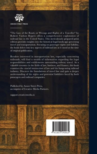 "The Law of the Road, or Wrongs and Rights of a Traveller" by Robert Vashon Rogers offers a comprehensive exploration of railroad law in the United States. This meticulously prepared print edition provides insights into the historical legal landscape governing travel and transportation. Focusing on passenger rights and liability, the book delves into key aspects of railroad law as it stood at the time of original publication. Readers interested in transportation law, especially concerning railroads, will find a wealth of information regarding the legal responsibilities and entitlements surrounding railway travel. As a valuable resource in the fields of law, business, and finance, this book examines the crucial intersection of law and the burgeoning railroad industry. Discover the foundations of travel law and gain a deeper understanding of the rights and potential liabilities faced by both passengers and railroad companies. This work has been selected by scholars as being culturally important, and is part of the knowledge base of civilization as we know it. This work is in the public domain in the United States of America, and possibly other nations. Within the United States, you may freely copy and distribute this work, as no entity (individual or corporate) has a copyright on the body of the work. Scholars believe, and we concur, that this work is important enough to be preserved, reproduced, and made generally available to the public. We appreciate your support of the preservation process, and thank you for being an important part of keeping this knowledge alive and relevant.