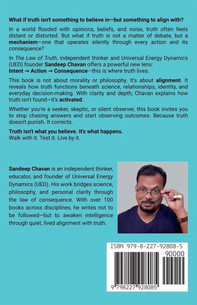 The Law of Truth: Decoding Reality Through Intent, Action, and Consequence, By Sandeep Chavan What if truth isn't what we've been told? What if it's not a belief to defend-but a force we interact with every day? In this groundbreaking and thought-provoking book, independent philosopher and Universal Energy Dynamics (UED) founder Sandeep Chavan challenges centuries of assumptions about truth. Drawing from science, philosophy, ancient wisdom, and lived experience, The Law of Truth reveals that truth isn't something you find-it's something you align with. Truth, as Chavan shows, is not a moral judgment, spiritual abstraction, or scientific theory. It is a mechanism-a living equation: Intent ¿ Action ¿ Consequence. This book does not preach. It observes. It offers a radical yet simple idea: you can trace the truth of anything by following the consequence it leaves behind. From Newton to Buddha, from quantum physics to personal decision-making, Chavan weaves a clear and original framework that:Redefines truth as a dynamic path, not a fixed point Exposes illusion as incomplete perception-not failure Shows how every field-science, psychology, morality-is governed by a hidden law of consequence Introduces Chavan's Law and Chavan's Limit-two principles that explain how systems balance, collapse, and realign Helps readers decode life, relationships, systems, and self with startling clarity Whether you're a seeker, scientist, student, skeptic, or simply someone feeling overwhelmed in a noisy, opinion-driven world, this book will help you:Anchor to clarity in chaos Understand feedback as the universe's compass Replace reaction with realignment Live truthfully without needing to defend, declare, or doubt The Law of Truth is not a philosophy to memorize. It's a compass to return to. It doesn't ask you to be perfect-only to be aware. And once you begin observing through the lens of UED, the world never looks the same again. Truth isn't what you believe. It's what happens. Walk with it. Test it. Become it.