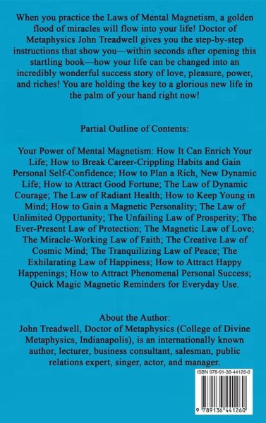 When you practice the Laws of Mental Magnetism, a golden flood of miracles will flow into your life! Doctor of Metaphysics John Treadwell gives you the step-by-step instructions that show you-within seconds after opening this startling book-how your life can be changed into an incredibly wonderful success story of love, pleasure, power, and riches! You are holding the key to a glorious new life in the palm of your hand right now! Partial Outline of Contents: Your Power of Mental Magnetism: How It Can Enrich Your Life; How to Break Career-Crippling Habits and Gain Personal Self-Confidence; How to Plan a Rich, New Dynamic Life; How to Attract Good Fortune; The Law of Dynamic Courage; The Law of Radiant Health; How to Keep Young in Mind; How to Gain a Magnetic Personality; The Law of Unlimited Opportunity; The Unfailing Law of Prosperity; The Ever-Present Law of Protection; The Magnetic Law of Love; The Miracle-Working Law of Faith; The Creative Law of Cosmic Mind; The Tranquilizing Law of Peace; The Exhilarating Law of Happiness; How to Attract Happy Happenings; How to Attract Phenomenal Personal Success; Quick Magic Magnetic Reminders for Everyday Use. About the Author: John Treadwell, Doctor of Metaphysics (College of Divine Metaphysics, Indianapolis), is an internationally known author, lecturer, business consultant, salesman, public relations expert, singer, actor, and manager. His phenomenal success in each of these fields led him to formulate the powerful laws of Mental Magnetism to share his great triumphs with those less fortunate. By using the dynamic techniques that he sets down here, John Treadwell has opened up a life of bountiful blessings. Now, this same wonderful life is in store for you!