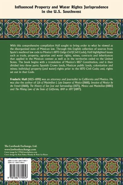With this comprehensive compilation Hall sought to bring order to what he viewed as the disorganized state of Mexican law. With a new introduction by Peter L. Reich, Professor of Law and Sumner Scholar, Whittier Law School. Originally published: San Francisco: A.L. Bancroft and Company, 1885. (v-xx new introduction), cxxiv, 809, [811*]-862*, [811]-840 pp. Through this English collection of sources from Spain's medieval law code tMexico's 1870 Código Civil (Civil Code), Hall highlighted issues such as trade, property, agrarian and water rights, mines, contracts and inheritances that applied in the Mexican context as well as in the territories ceded to the United States. The book begins with a translation of Mexico's 1857 Constitution, and is then divided into three parts: Spanish Crown lands, Mexican public lands, colonization and mines; individual property (and water) rights prior to the 1870 Civil Code; and, rights set out in that Code. Frederic Hall (1825-1898) was an attorney and journalist in California and Mexico. He was also the author of Life of Maximilian I, Late Emperor of Mexico (1868), Invasion of Mexico by the French (1868), The History of San José and Surroundings (1871), Mexico and Maximilian (1880) and The Mining Laws of the State of California, 1849 to 1897 (1897).