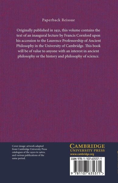 Originally published in 1931, this volume contains the text of an inaugural lecture by Francis Cornford upon his accession to the Laurence Professorship of Ancient Philosophy in the University of Cambridge. This book will be of value to anyone with an interest in ancient philosophy or the history and philosophy of science.