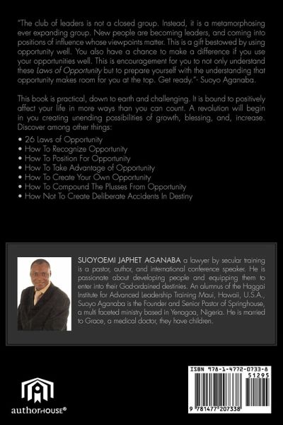 "The club of leaders is not a closed group. Instead, it is a metamorphosing ever expanding group. New people are becoming leaders, and coming into positions of influence whose viewpoints matter. This is a gift bestowed by using opportunity well. You also have a chance to make a difference if you use your opportunities well. This is encouragement for you to not only understand these Laws of Opportunity but to prepare yourself with the understanding that opportunity makes room for you at the top. Get ready."- Suoyo Aganaba. This book is practical, down to earth and challenging. It is bound to positively affect your life in more ways than you can count. A revolution will begin in you creating unending possibilities of growth, blessing, and, increase. Discover among other things: ¿ 26 Laws of Opportunity ¿ How To Recognize Opportunity ¿ How To Position For Opportunity ¿ How To Take Advantage of Opportunity ¿ How To Create Your Own Opportunity ¿ How To Compound The Plusses From Opportunity ¿ How Not To Create Deliberate Accidents In Destiny