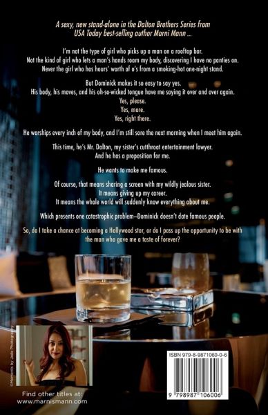 A sexy, billionaire, Hollywood, stand-alone romance from USA Today best-selling author Marni Mann ... I'm not the type of girl who picks up a man on a rooftop bar. Not the kind of girl who lets a man's hands roam my body, discovering I have no panties on. Never the girl who has hours' worth of o's from a smoking-hot one-night stand. But Dominick makes it so easy to say yes. His body, his moves, and his oh-so-wicked tongue have me saying it over and over again. Yes, please. Yes, more. Yes, right there. He worships every inch of my body, and I'm still sore the next morning when I meet him again. This time, he's Mr. Dalton, my sister's cutthroat entertainment lawyer. And he has a proposition for me. He wants to make me famous. Of course, that means sharing a screen with my wildly jealous sister. It means giving up my career. It means the whole world will suddenly know everything about me. Which presents one catastrophic problem-Dominick doesn't date famous people. So, do I take a chance at becoming a Hollywood star, or do I pass up the opportunity to be with the man who gave me a taste of forever? There are five stand-alone books in the Dalton Family Series: The Lawyer The Billionaire The Single Dad The Intern The Bachelor