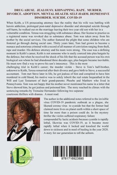 DRUG ABUSE. JEALOUSY. KIDNAPPING. RAPE. MURDER. DIVORCE. ADOPTION. MENTAL HEALTH. SELF-HARM. DEPRESSIVE DISORDER. SUICIDE. COVID-19When Keith, a US prosecuting attorney face the reality that his wife was battling with heroin addiction, prolonged post-natal depressive disorder and attempted suicide through self-harm, he walked out on the marriage leaving their two year old son with her in a vulnerable condition. Teresa was struggling with substance abuse. Her license to practice as a registered nurse was revoked due to substance abuse. Tom was taken away from his mother by the social services. The author featured the plight that some children who are fostered go through during social care. Thirty years later Tom had grown to become a menace and notorious criminal with a record of all manner of conviction ranging from theft, rape and murder. His defence attorney and his team were strong. The case is a defining moment in Keith's career, Keith is not someone who is easily coerced into plea bargaining by the defence, but when he received the shock of his life that the accused person was his own biological son whom he had abandoned three decades ago, plea bargaining became inevitable. He must now find a way to prove his son's innocence. This is the most challenging trial in Keith's career; the murder victim - Steve is Tom's half-brother, unknown to Keith, Teresa remarried after their divorce and gave birth to Steve, a successful accountant. Tom met Steve later in life, he got jealous of him and conspired to have him murdered in cold blood, his motive was to solely inherit the real estate bequeathed in the Will and Last Testament of their grand-parents: Phoebe and Matthew who lived in Pennsylvania. Tom was not happy that his mother never mentioned his name in a letter Steve showed him when they met, he got jealous and poisoned him. The story reached its climax with the sentencing remarks by Tremaine Hernandez following two separate courtroom thrillers with hilarious dramas. A must read.