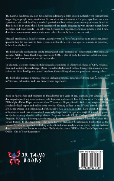 The Lazarus Syndrome is a non-fictional book detailing a little-known medical event that has been happening to people for centuries but did not draw attention until a few years ago. It occurs when a patient is declared dead by a medical professional but revives spontaneously minutes, hours or days later. It is an event that I have experienced but rarely discussed it with anyone except family members and close friends. The difference between my experience and most others is that I have done it on numerous occasions while most others have only done it once or twice. Medical professionals failed to report Lazarus events in fear of malpractice suits and other consequences they did not want to face. It turns out that the event is not quite as unusual as previously believed or admitted to. The book details case histories listing amazing and even "miraculous" resuscitations. The book also includes NDEs - Near Death Experiences and OBEs - Out of body Experiences which are sometimes related to or consequences of one another. In addition, it covers related medical research attempting to improve methods of CPR, resuscitation, and avoiding brain damage. Other related fields discussed include Cryogenics, memory restoration, Artificial Intelligence, neural implants, Gene editing, electronic prosthetics among others. The book also includes a personal memoir including personal Lazarus Syndrome events, experience in Vietnam, Education, and Law Enforcement experience.