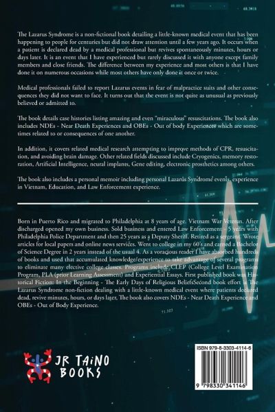 The Lazarus Syndrome is a non-fictional book detailing a little-known medical event that has been happening to people for centuries but did not draw attention until a few years ago. It occurs when a patient is declared dead by a medical professional but revives spontaneously minutes, hours or days later. It is an event that I have experienced but rarely discussed it with anyone except family members and close friends. The difference between my experience and most others is that I have done it on numerous occasions while most others have only done it once or twice. Medical professionals failed to report Lazarus events in fear of malpractice suits and other consequences they did not want to face. It turns out that the event is not quite as unusual as previously believed or admitted to. The book details case histories listing amazing and even "miraculous" resuscitations. The book also includes NDEs - Near Death Experiences and OBEs - Out of body Experiences which are sometimes related to or consequences of one another. In addition, it covers related medical research attempting to improve methods of CPR, resuscitation, and avoiding brain damage. Other related fields discussed include Cryogenics, memory restoration, Artificial Intelligence, neural implants, Gene editing, electronic prosthetics among others. The book also includes a personal memoir including personal Lazarus Syndrome events, experience in Vietnam, Education, and Law Enforcement experience.