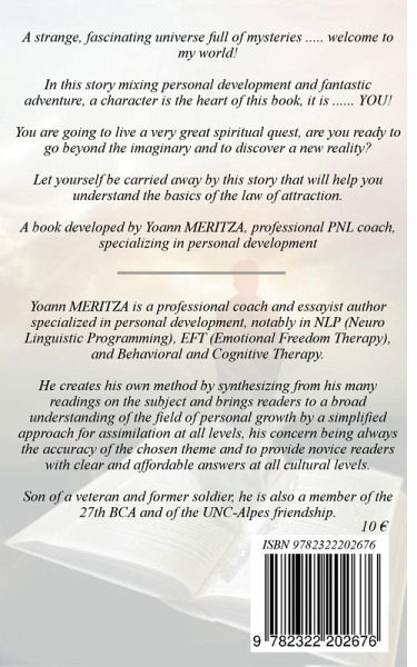 A strange, fascinating universe full of mysteries ..... welcome to my world!In this story mixing personal development and fantastic adventure, a character is the heart of this book, it is ...... YOU!You are going to live a very great spiritual quest, are you ready to go beyond the imaginary and to discover a new reality?Let yourself be carried away by this story that will help you understand the basics of the law of attraction.A book developed by Yoann MERITZA, professional PNL coach, specializing in personal development
