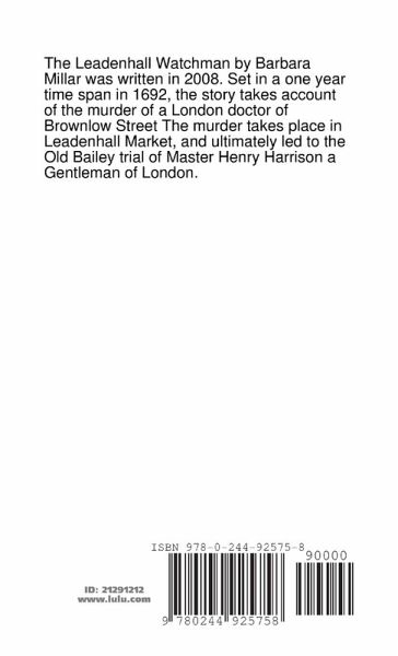 The Leadenhall Watchman by Barbara Millar was written in 2008. Set in a one year time span in 1692, the story takes account of the murder of a London doctor of Brownlow Street The murder takes place in Leadenhall Market, and ultimately led to the Old Bailey trial of Master Henry Harrison a Gentleman of London.