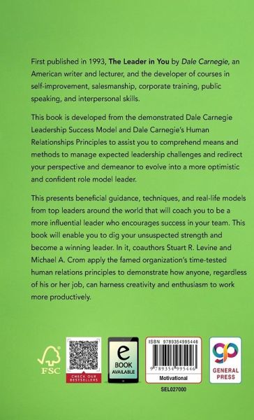 First published in 1993, 'The Leader in You' by Dale Carnegie, an American writer and lecturer, and the developer of courses in self-improvement, salesmanship, corporate training, public speaking, and interpersonal skills. This book is developed from the demonstrated Dale Carnegie Leadership Success Model and Dale Carnegie's Human Relationships Principles to assist you to comprehend means and methods to manage expected leadership challenges and redirect your perspective and demeanor to evolve into a more optimistic and confident role model leader. This presents beneficial guidance, techniques, and real-life models from top leaders around the world that will coach you to be a more influential leader who encourages success in your team. This book will enable you to dig your unsuspected strength and become a winning leader. In it, coauthors Stuart R. Levine and Michael A. Crom apply the famed organization's time-tested human relations principles to demonstrate how anyone, regardless of his or her job, can harness creativity and enthusiasm to work more productively.