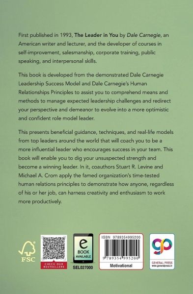 First published in 1993, 'The Leader in You' by Dale Carnegie, an American writer and lecturer, and the developer of courses in self-improvement, salesmanship, corporate training, public speaking, and interpersonal skills. This book is developed from the demonstrated Dale Carnegie Leadership Success Model and Dale Carnegie's Human Relationships Principles to assist you to comprehend means and methods to manage expected leadership challenges and redirect your perspective and demeanor to evolve into a more optimistic and confident role model leader. This presents beneficial guidance, techniques, and real-life models from top leaders around the world that will coach you to be a more influential leader who encourages success in your team. This book will enable you to dig your unsuspected strength and become a winning leader. In it, coauthors Stuart R. Levine and Michael A. Crom apply the famed organization's time-tested human relations principles to demonstrate how anyone, regardless of his or her job, can harness creativity and enthusiasm to work more productively.